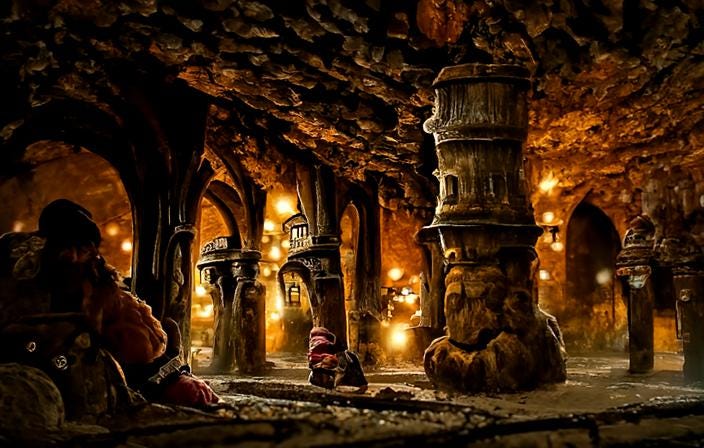"The Dwarves had built an entire city under the mountain, carved out of rock. The place was as old as it was majestic, with small luminescent crystals acting as torches, bathing the paved streets in a dim, warm light. In spite of the absence of sky, it all gave off a sense of security and comfort. | underground, urban landscape, columns, arches, medieval, comfortable"